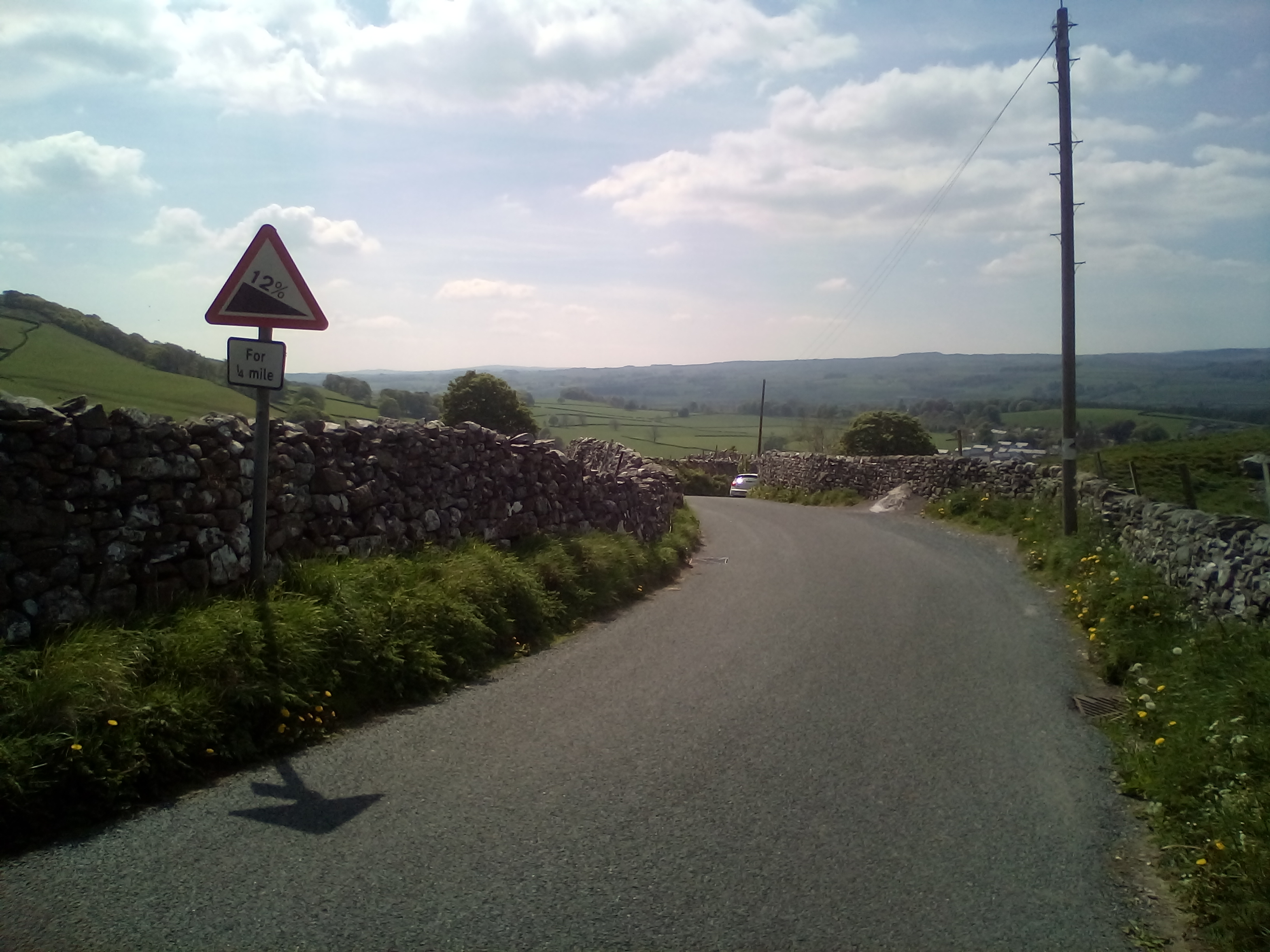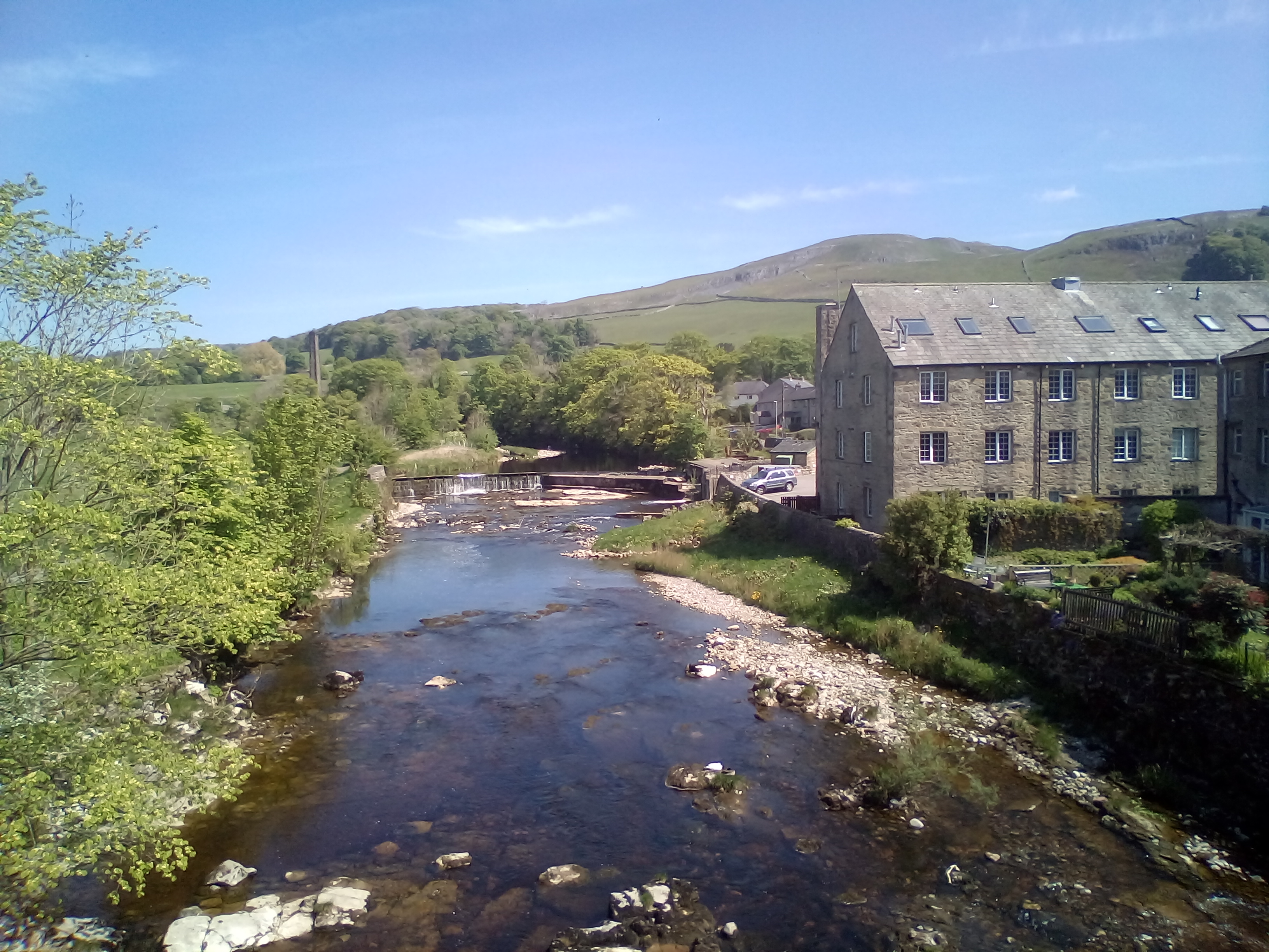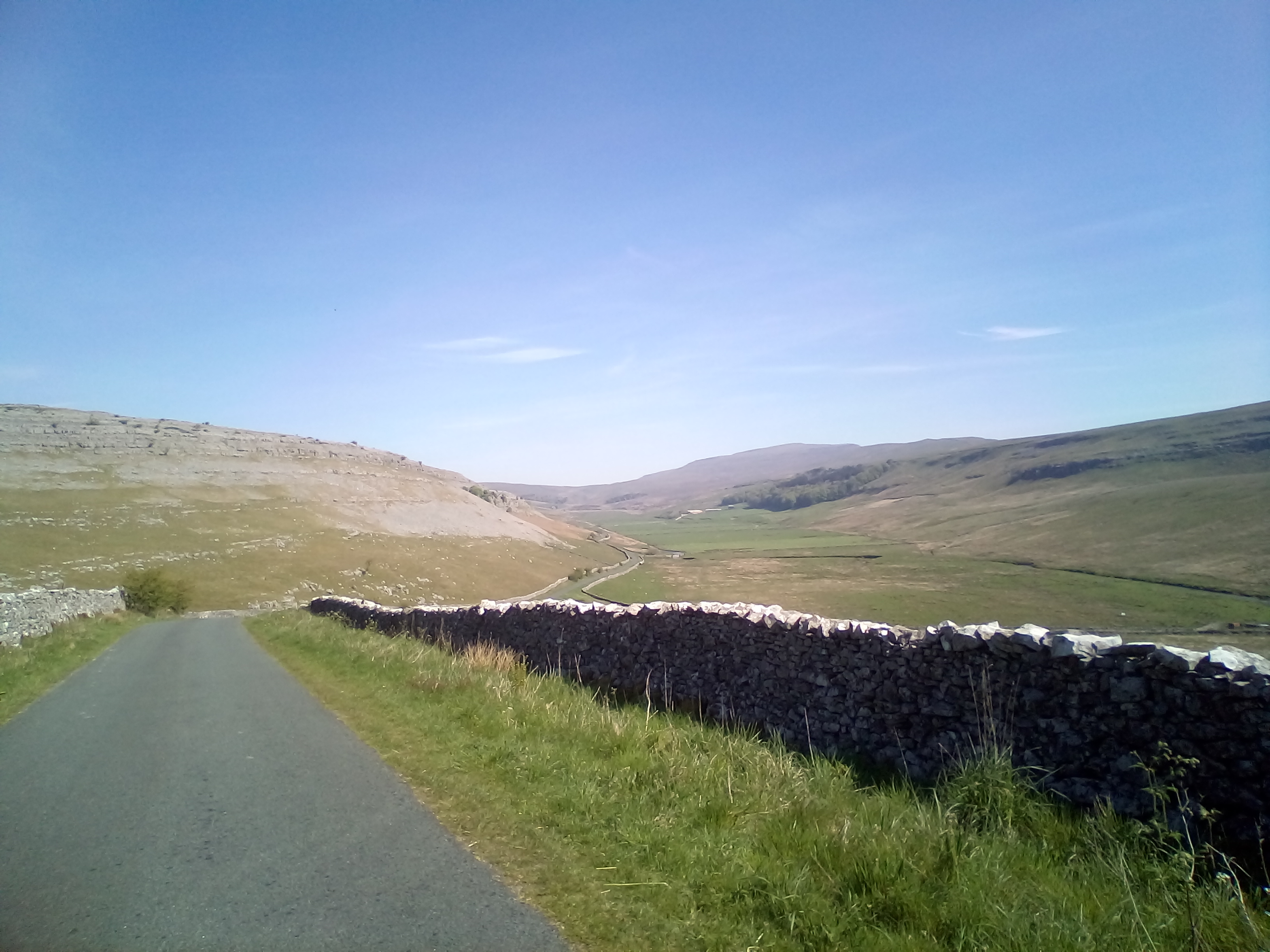 After spending an hour getting up the first 4 miles of hill to reach 1500ft , there was the reward of perhaps the best downhill of the whole trip down to Ingleton. From the photos, you can see it was beautiful weather again. Route goes down the river valley on straightish roads with very little traffic and wide open views across the river and the limestone rocks.
